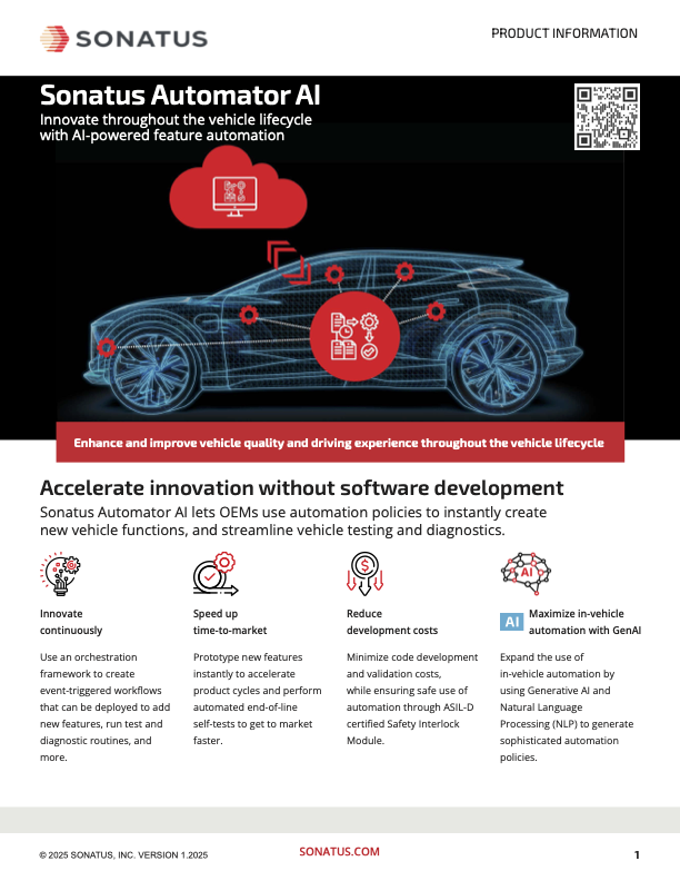 Mit Sonatus Automator AI können OEMs Automatisierungsabläufe festlegen, um sofort neue Fahrzeugfunktionen zu erstellen und Fahrzeugtests und Fahrzeugdiagnosen zu optimieren.