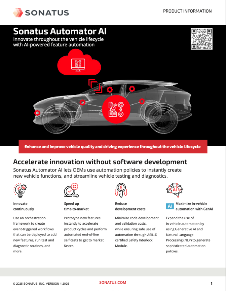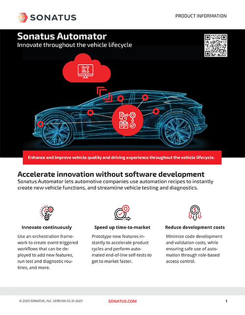 Sonatus Automator AI lets OEMs use automation policies to instantly create new vehicle functions, and streamline vehicle testing and diagnostics.