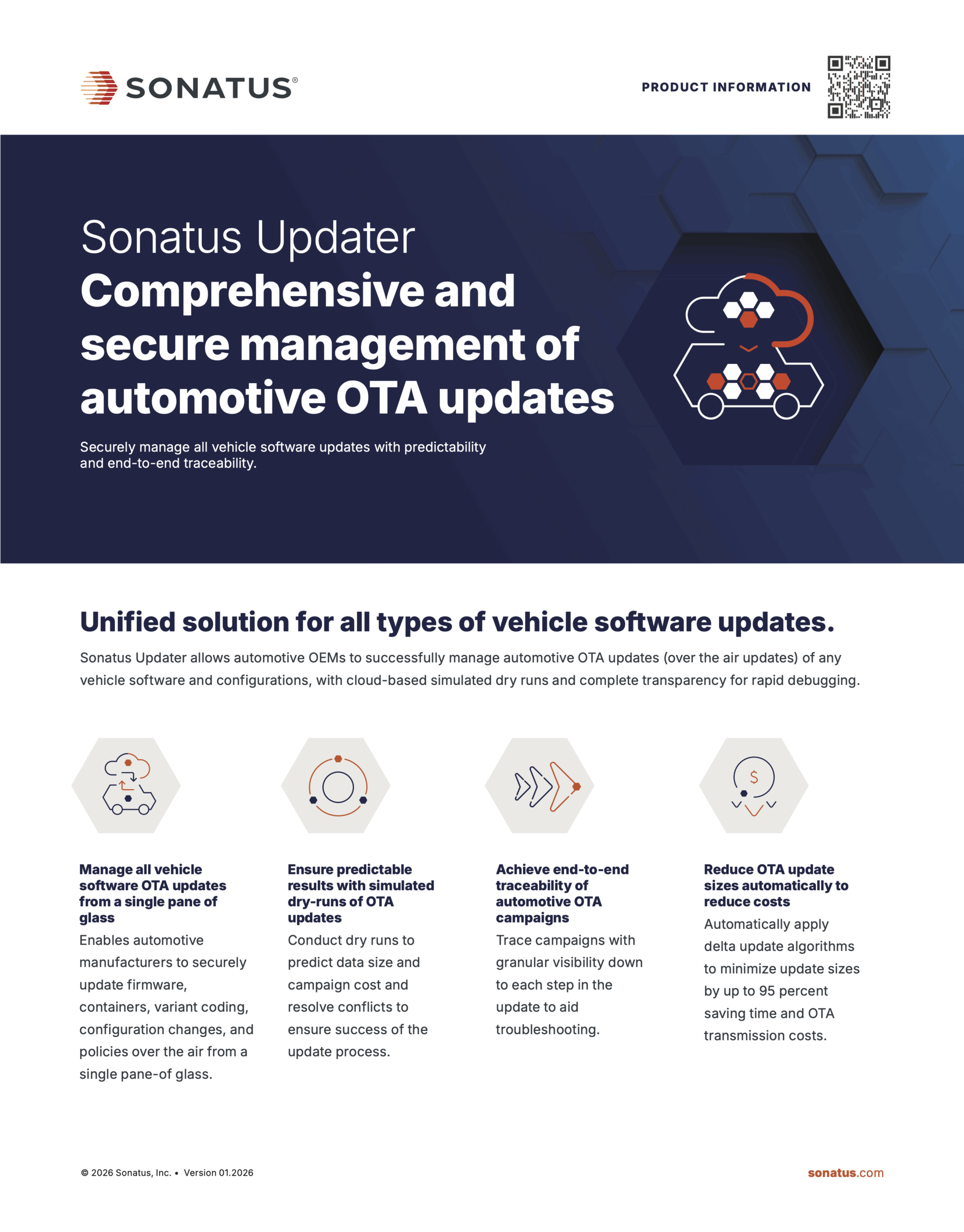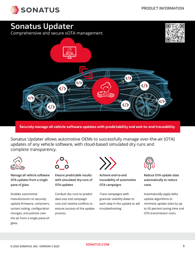 Learn how Sonatus Updater is purpose-built to handle the rigors of OTA updates as the industry transitions to SDVs, delivering: