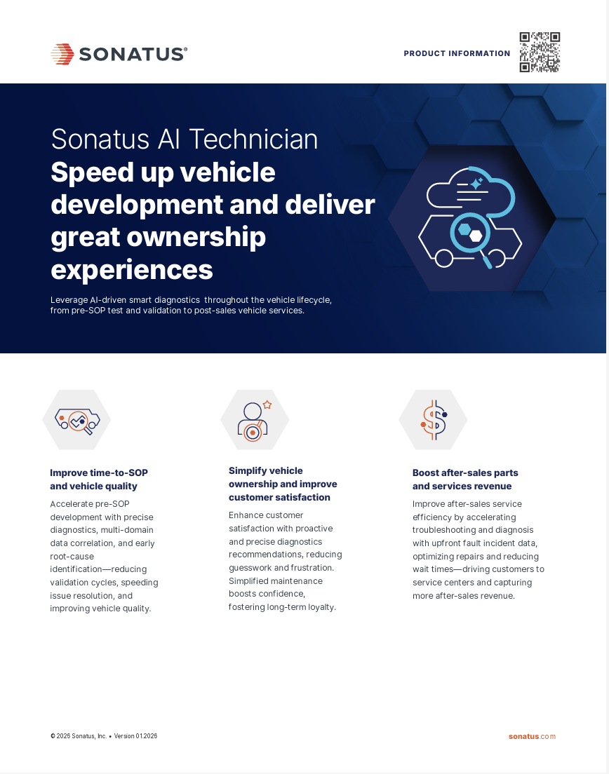 Sonatus AI Technicians deliver tangible benefits and cost savings at multiple points in the vehicle development, pre-SOP testing and validation, and post-sales vehicle ownership services.