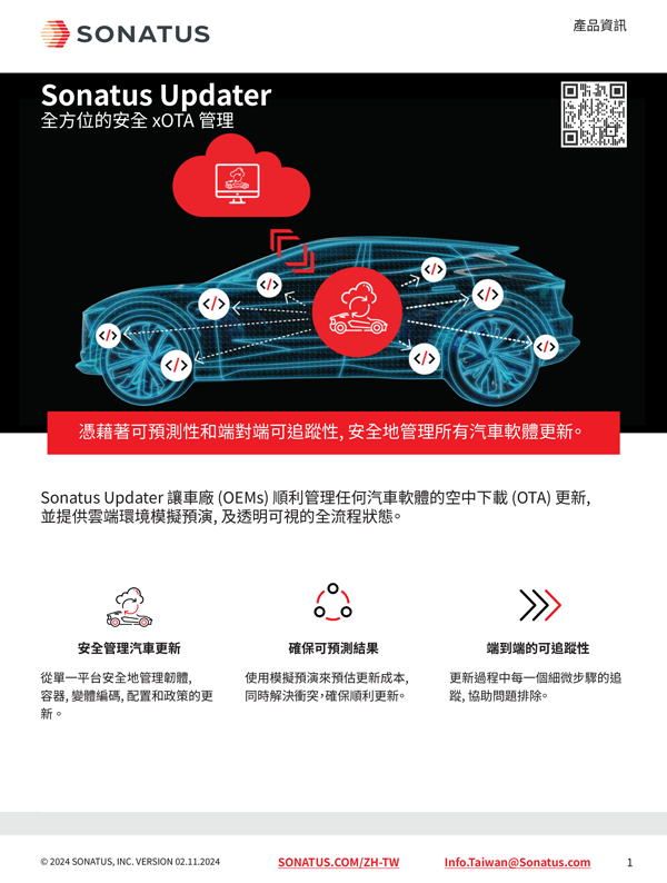 Sonatus Updater 讓車廠 (OEMs) 順利管理任何汽車軟體的空中下載 (OTA) 更新,並提供雲端環境模擬預演,及透明可視的全流程狀態。